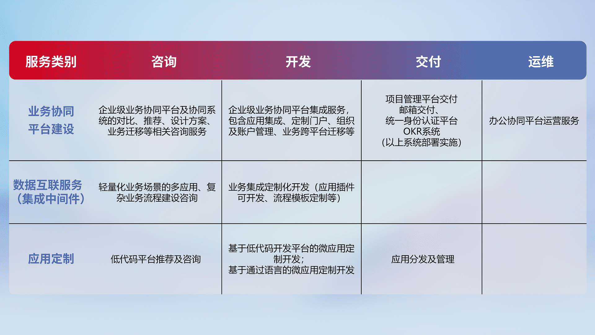 针对钉钉、、企微、、、、IDaas等平台级产品提供产品的规划、、、、方案、、交付、、、定制化开发等服务,,实现如统一协同办公、、、智能客户服务、、、、混合会议管理、、、、智能数据查询、、、等业务场景,,,,实现数字化转型。。。。