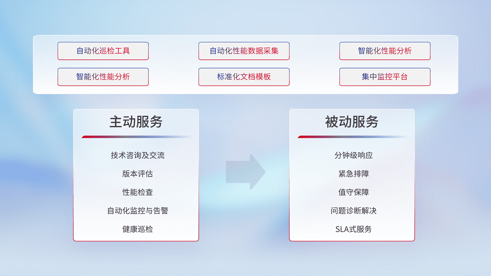 智能化工具和标准化文档,,保障服务质量,,提供主动服务(包含技术咨询、、、版本评估、、、性能检查、、、、自动化监控与告警、、、健康巡检)和被动服务包含(分钟级响应、、、紧急排障、、值守保障、、、、问题诊断解决、、、SLA服务)。。。。