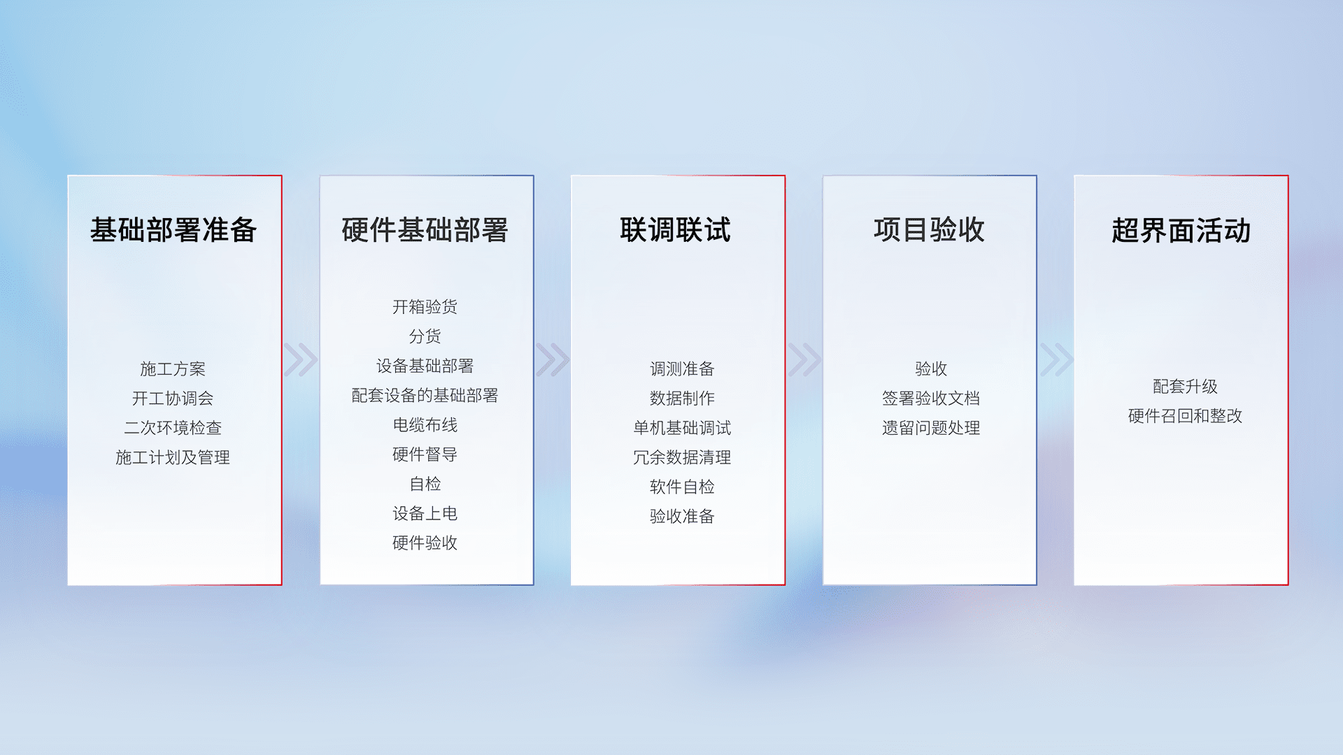 从基础部署准备、、硬件基础部署、、、联调联试、、、项目验收、、越界面活动的全过程可追溯,,,,保证施工质量和进度。。。。
